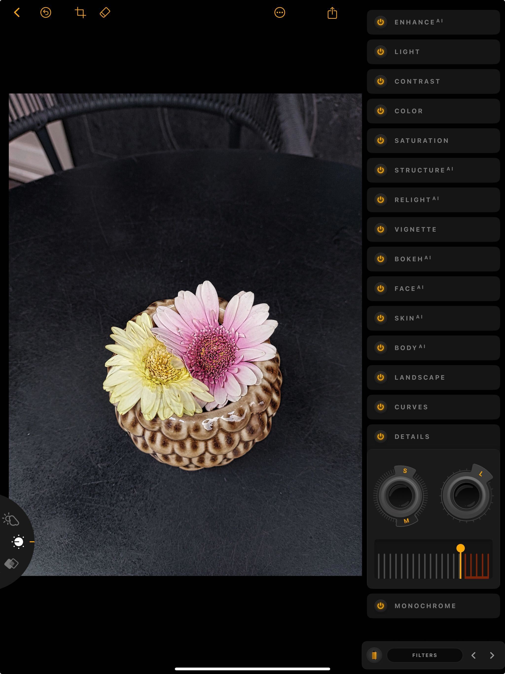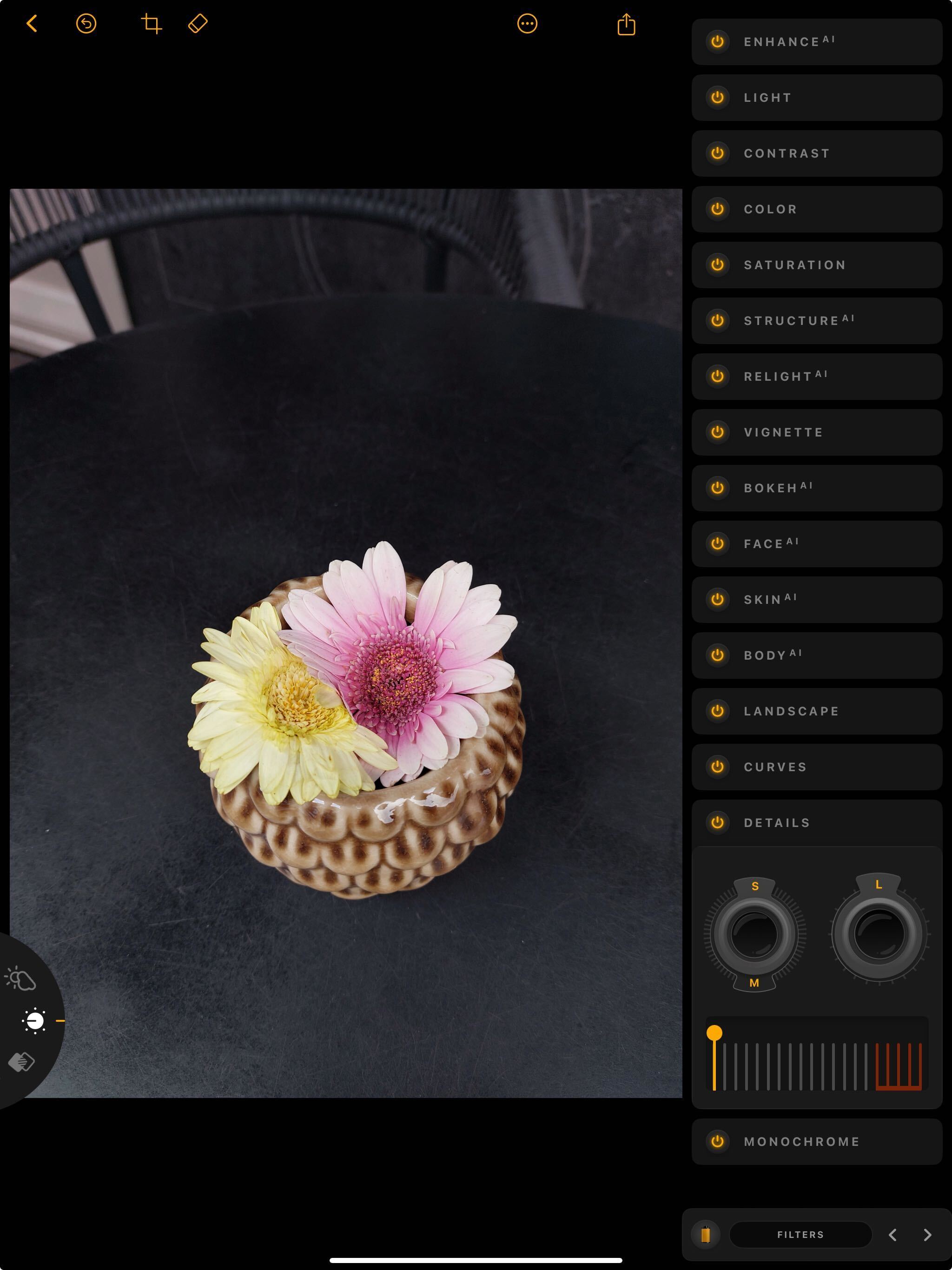 **How to Use:** Tap Details, then use circular finger motions on the image to enhance S, M, or L. Use the horizontal slider for overall sharpness.