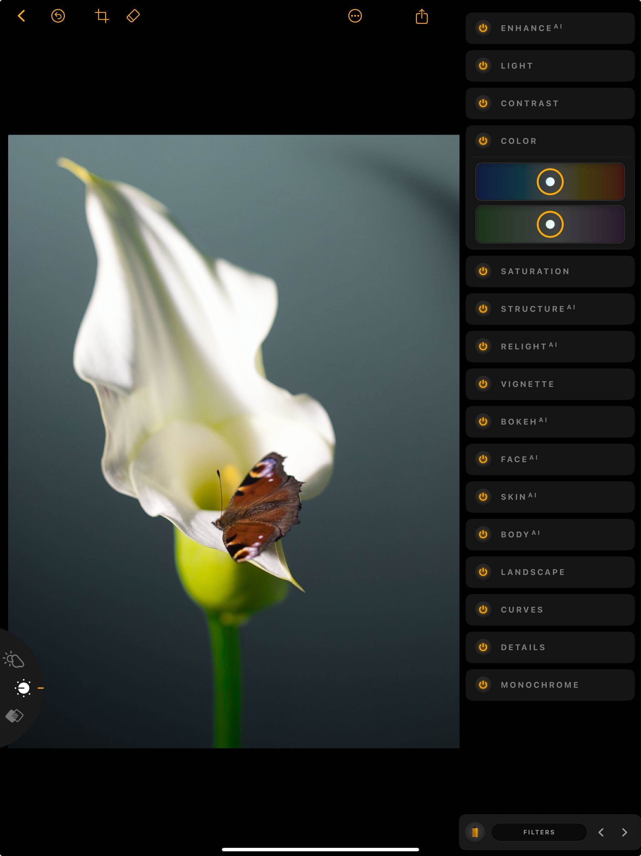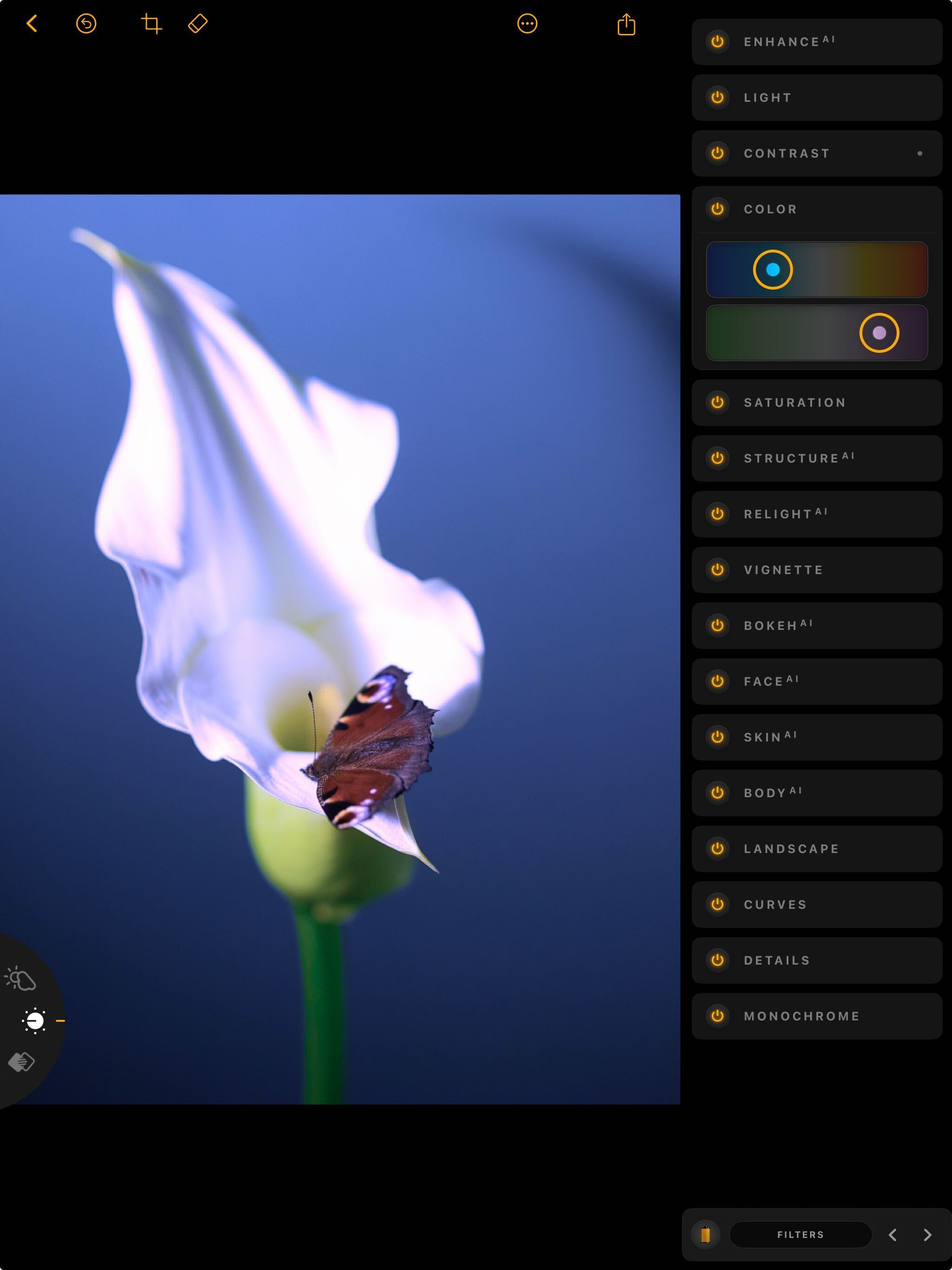 **How to Use:** Tap the Color icon and use the sliders to shift temperature and tint.