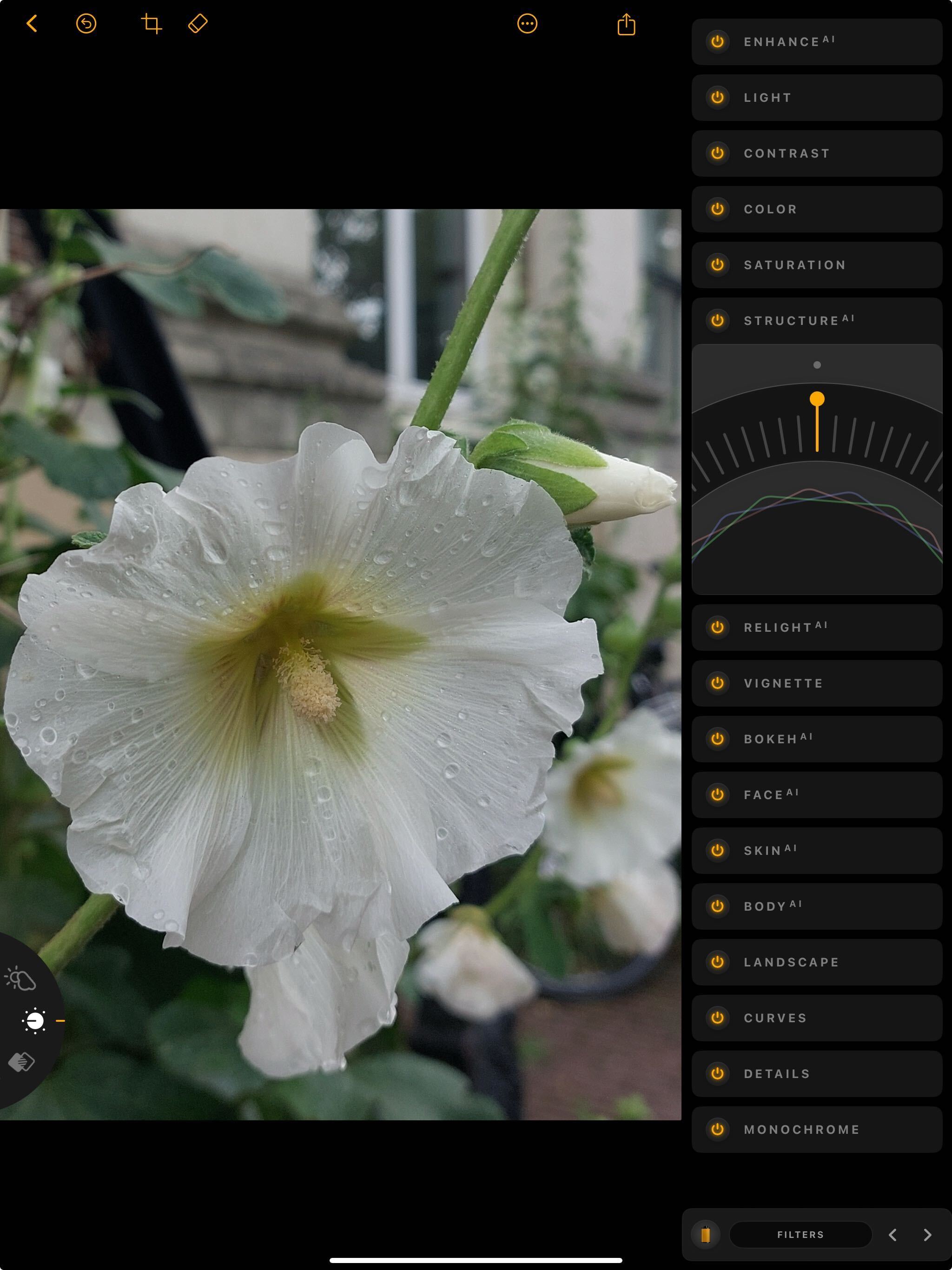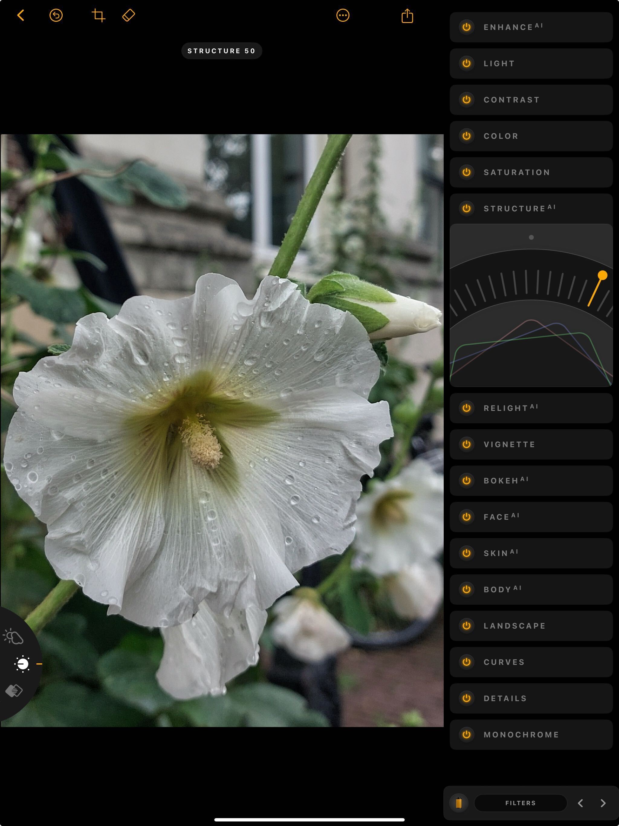 **How to Use:** Tap the Structure AI icon. Use the dial to apply more or less structure. As you increase the value, edges and surfaces become crisper while faces remain smooth and natural.