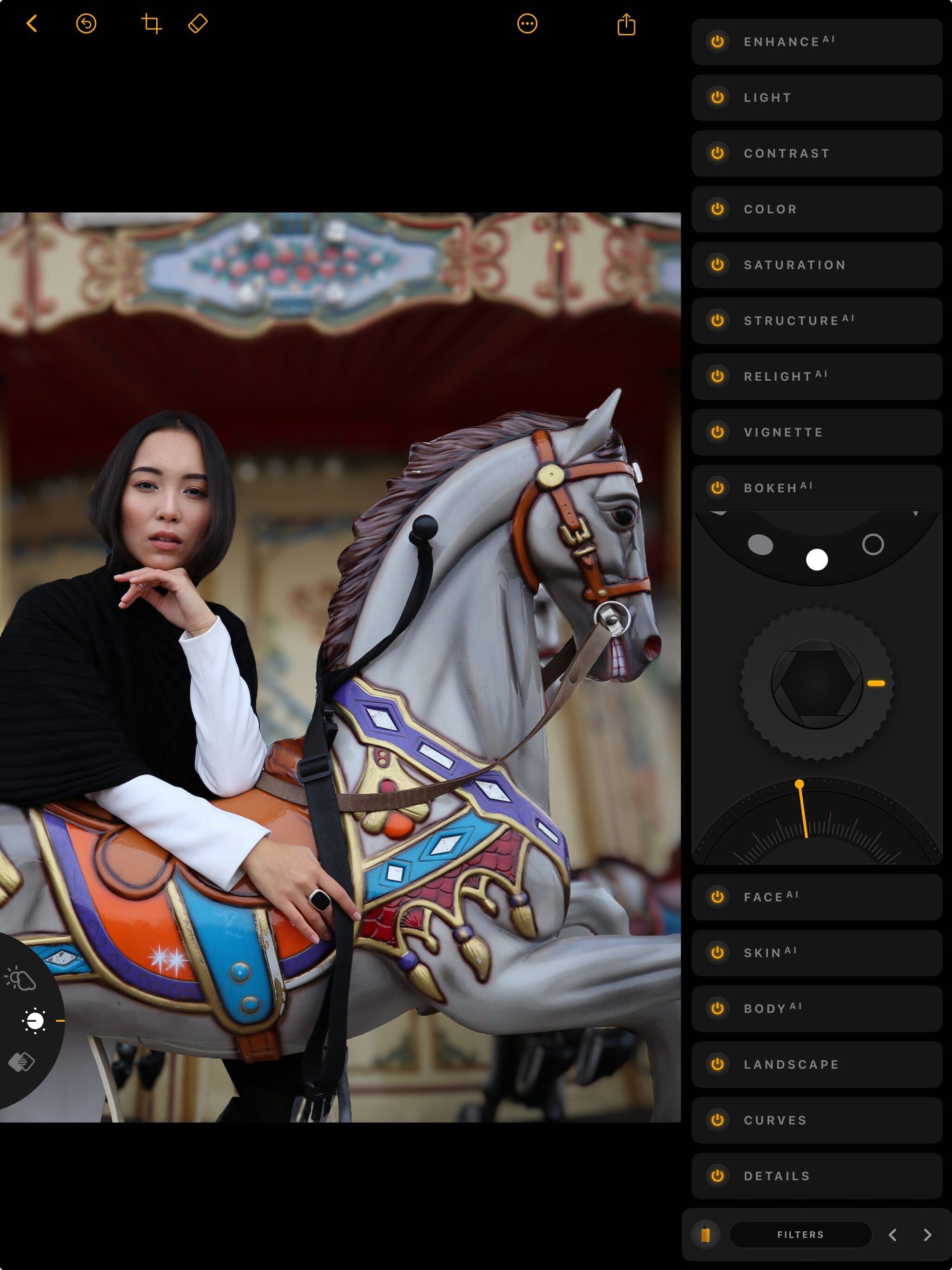 Bokeh AI creates a portrait-style depth effect after the shot. It allows you to separate the subject from the background, control blur intensity, and customize the appearance of background light shapes for a more polished, cinematic result.