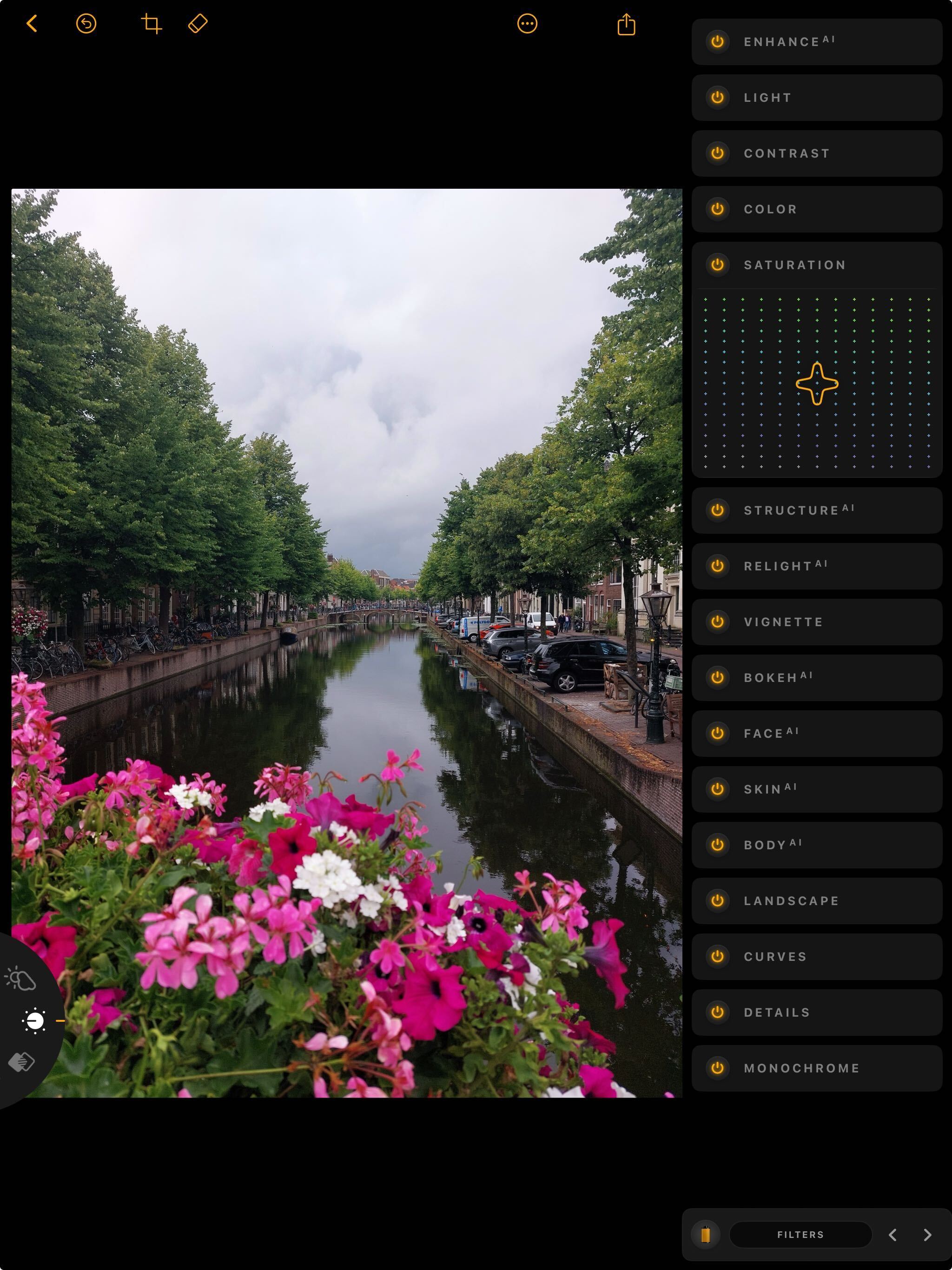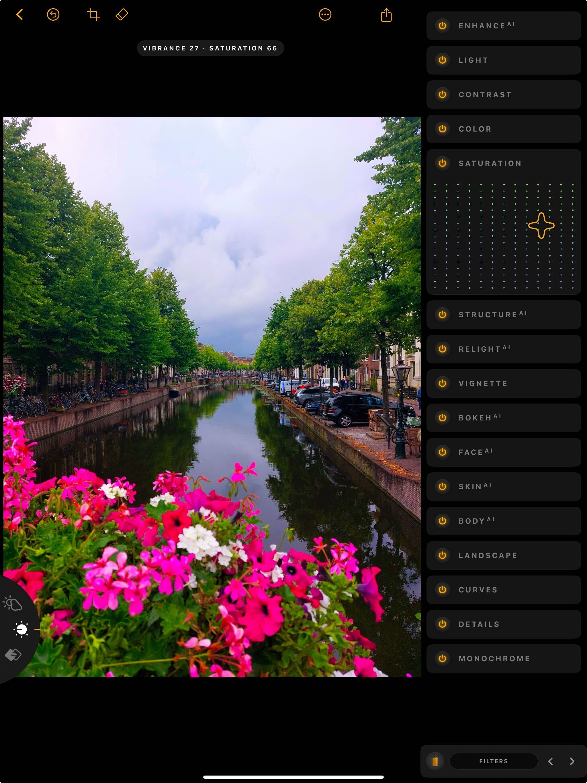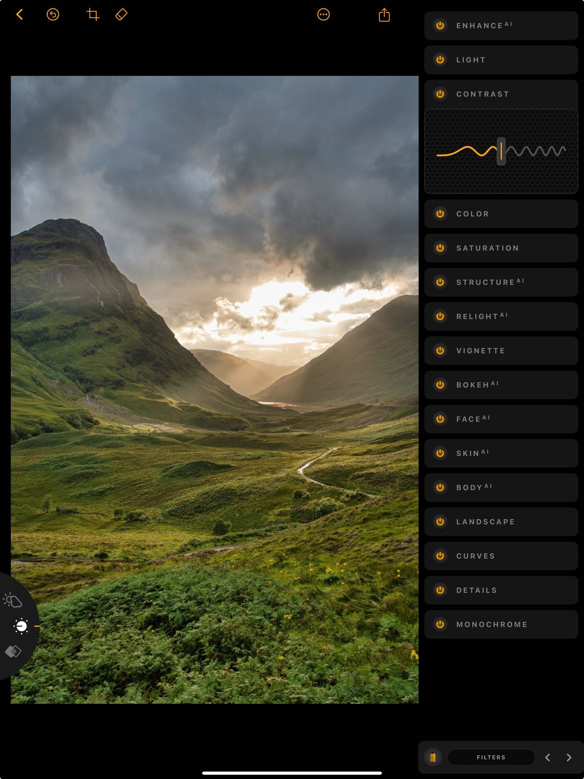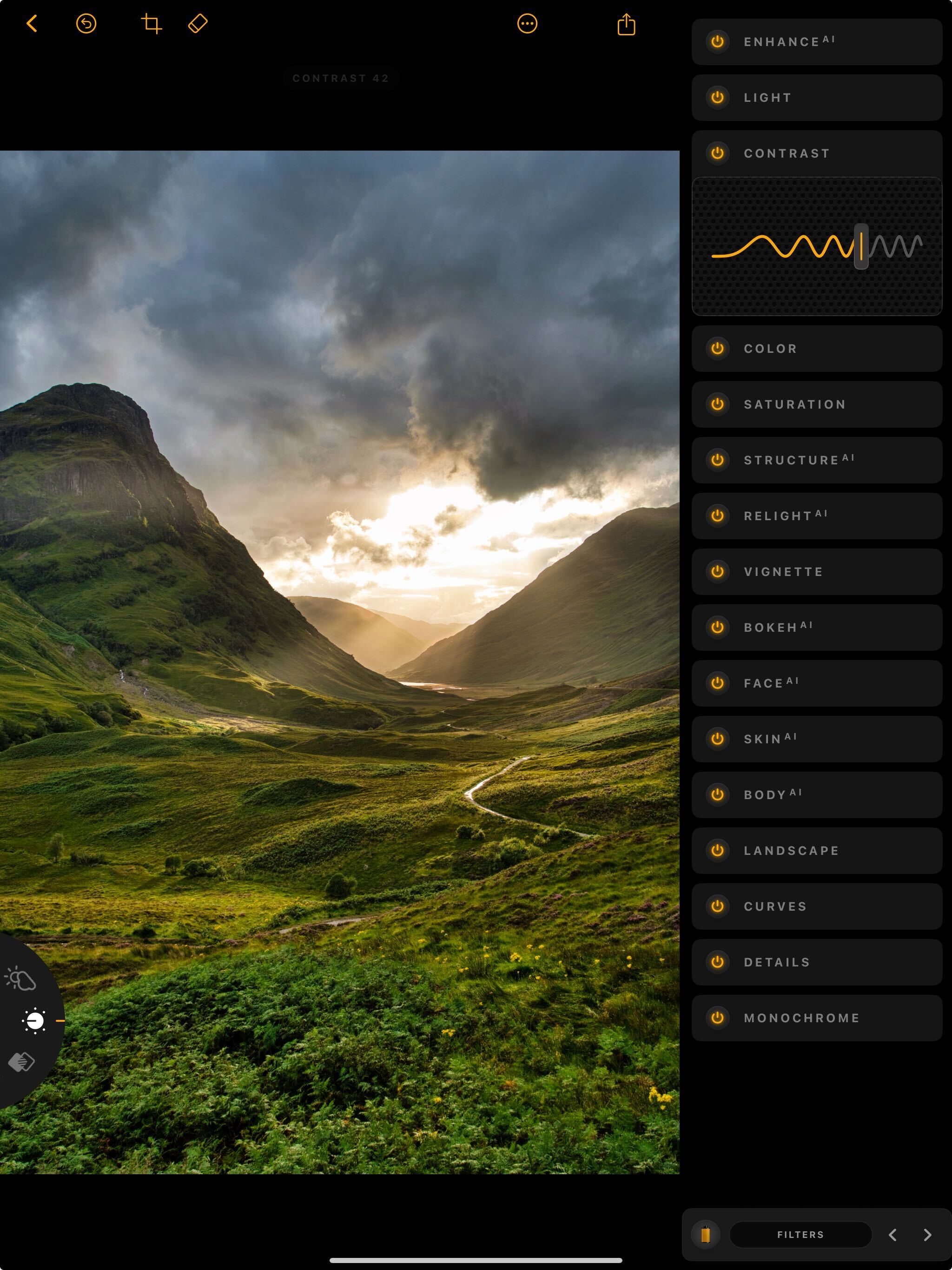 Filters in Luminar provide a quick way to enhance your images. Scroll, select, and apply filters to change the mood or tone with a tap. Adjust intensity for the perfect effect and save favorites for quick access, making photo enhancement effortless.