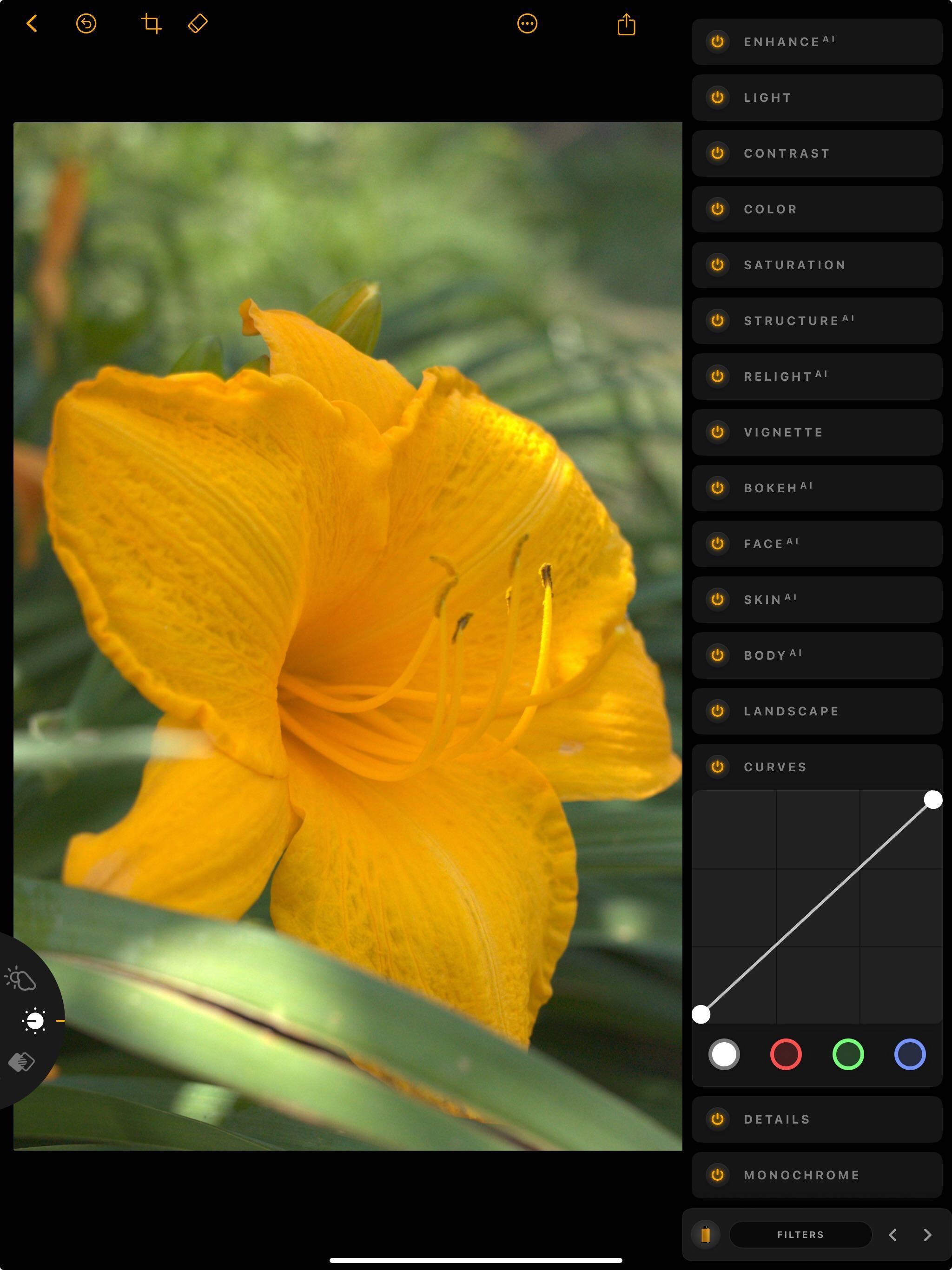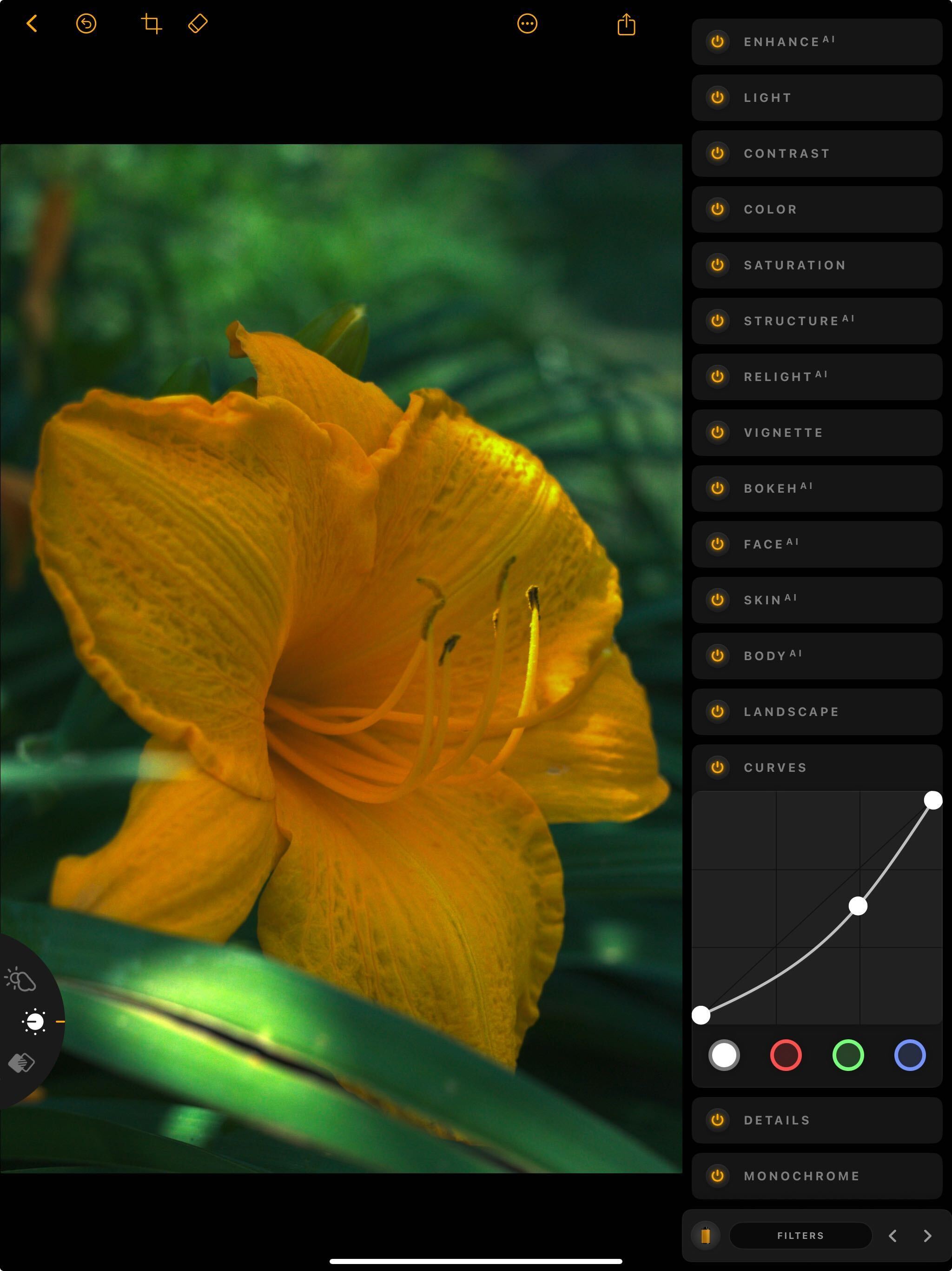 Curves are essential for adjusting brightness, darkness, contrast, or color in your photos. It's a powerful tool for subtly shaping the mood and feel of your images.