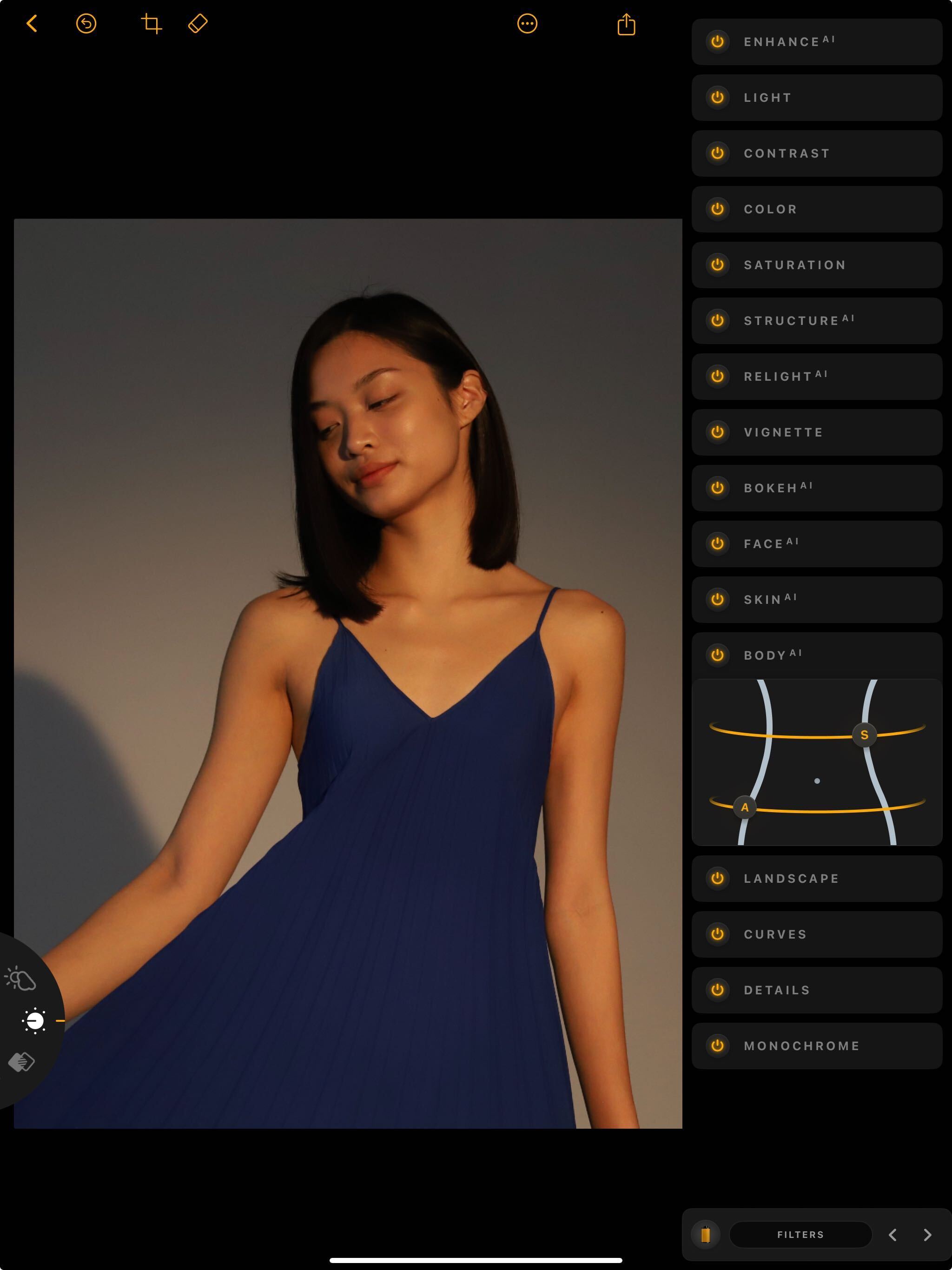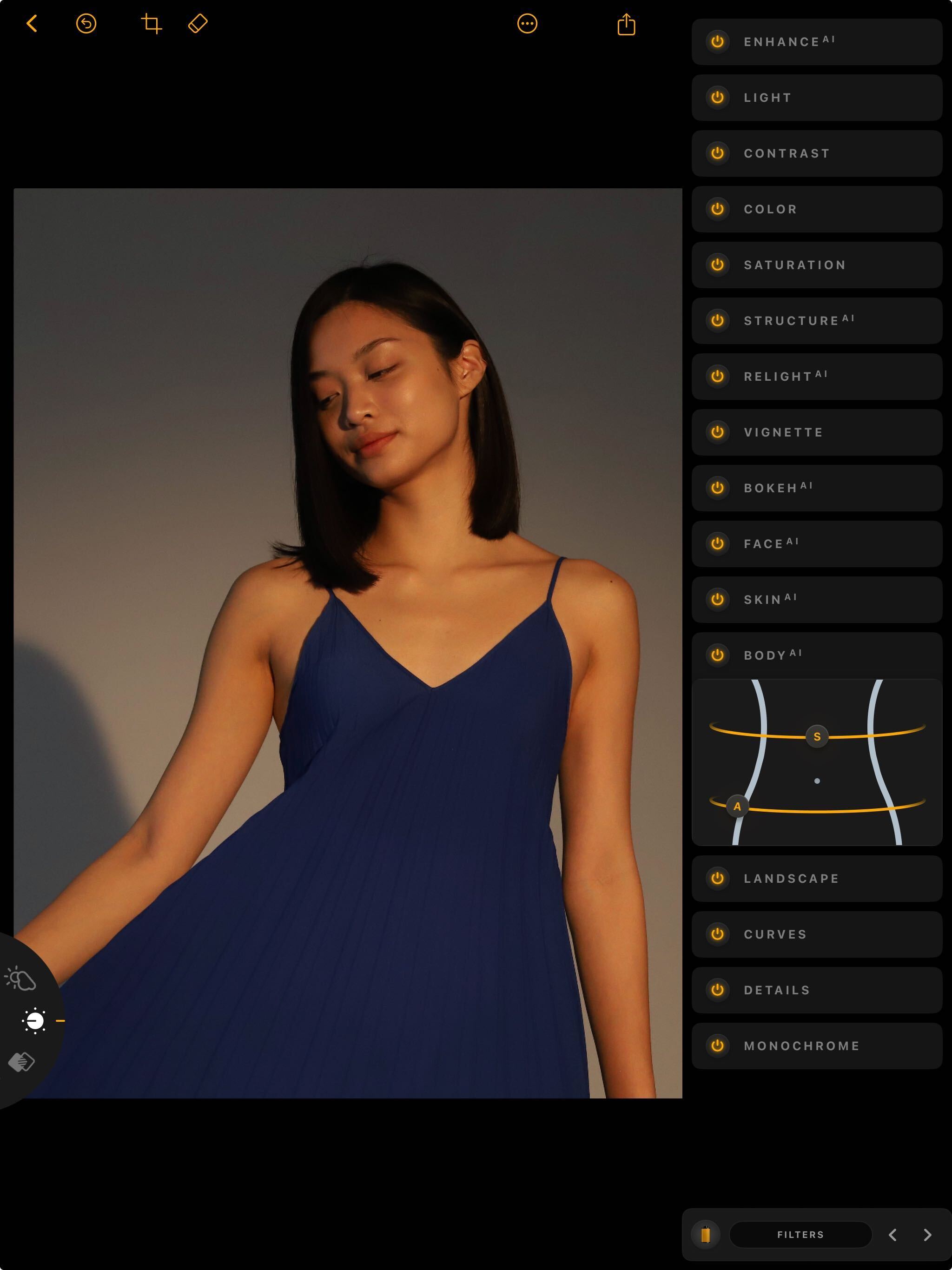 **How to Use:** Tap the Body AI icon when editing an image with a visible body. Slide A and S to gently refine shape.