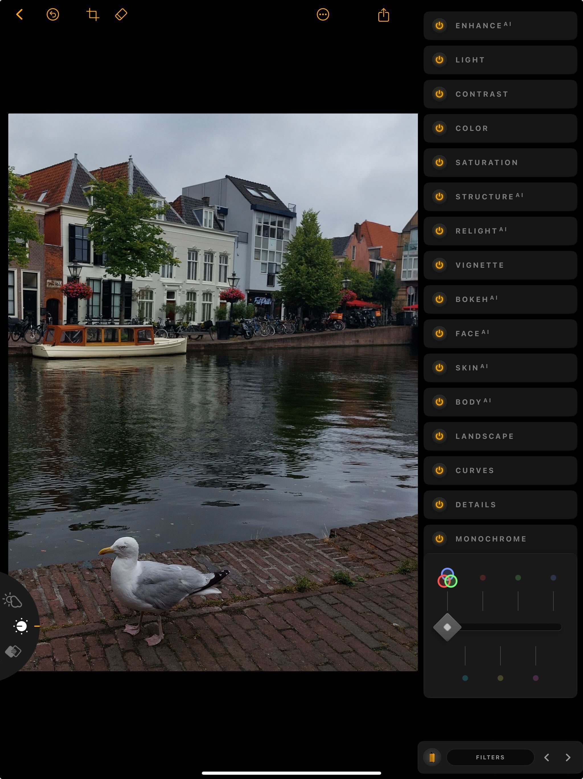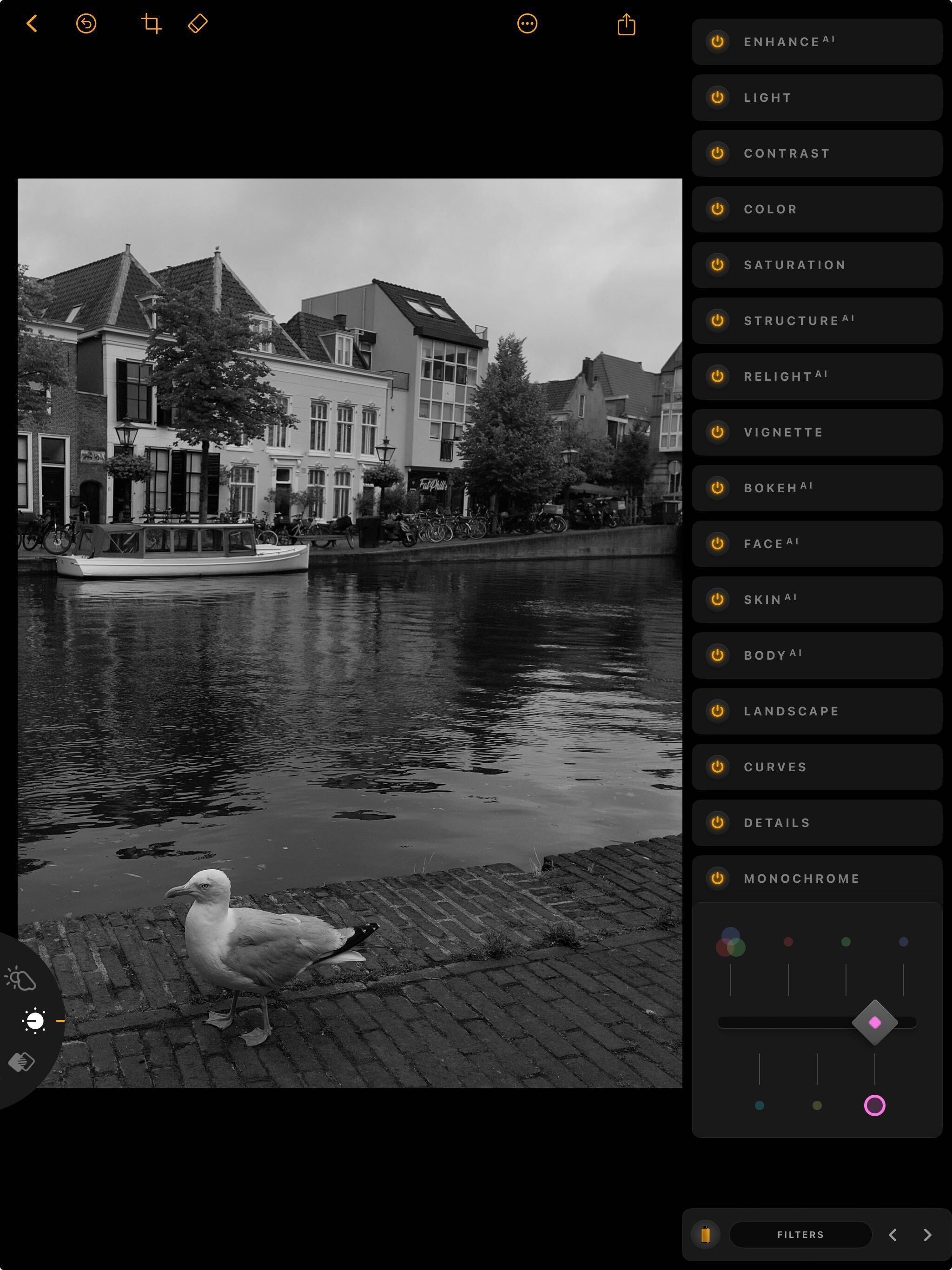 **How to Use:** Tap the Monochrome icon and slide to test different B\&W styles.