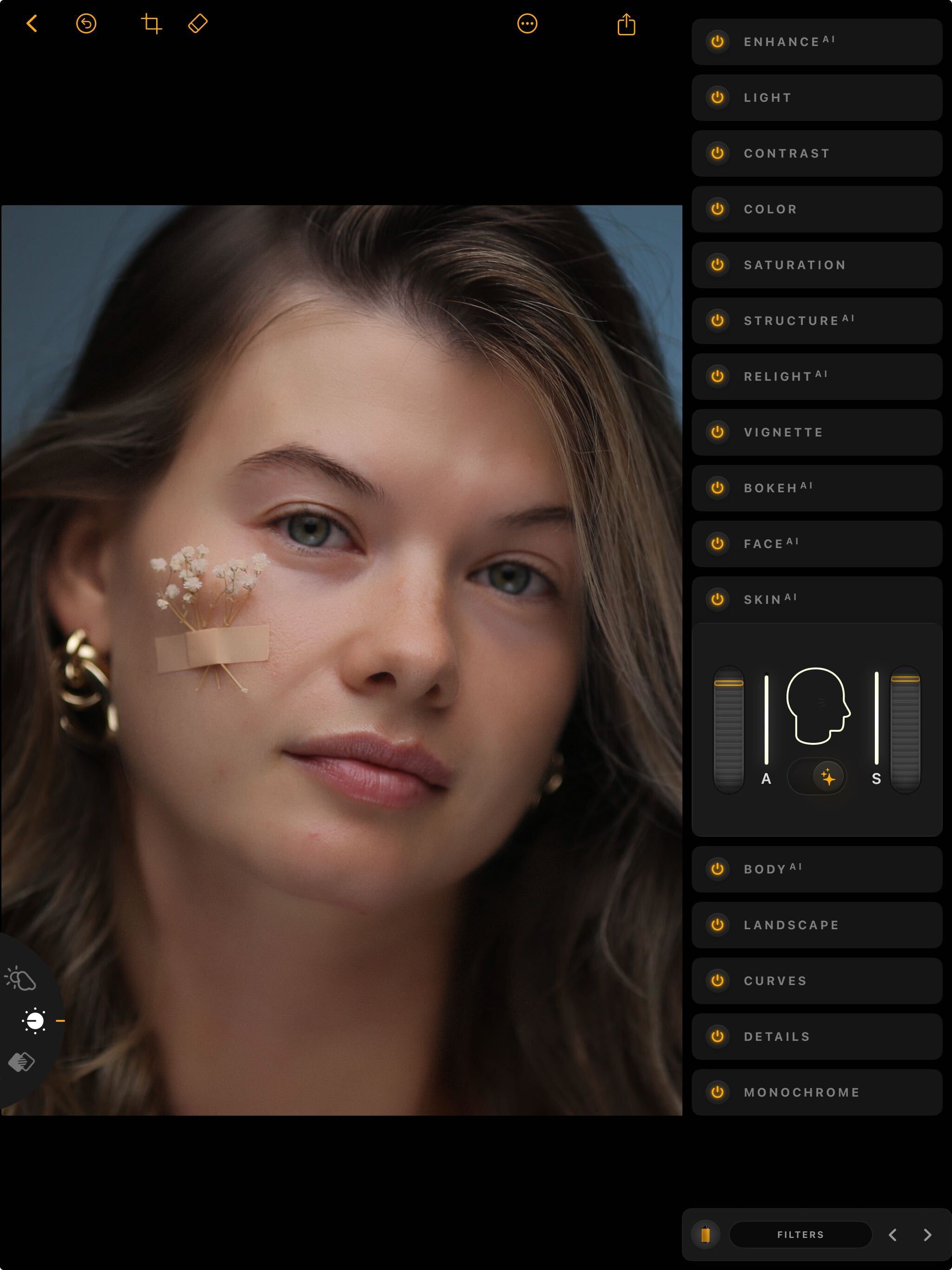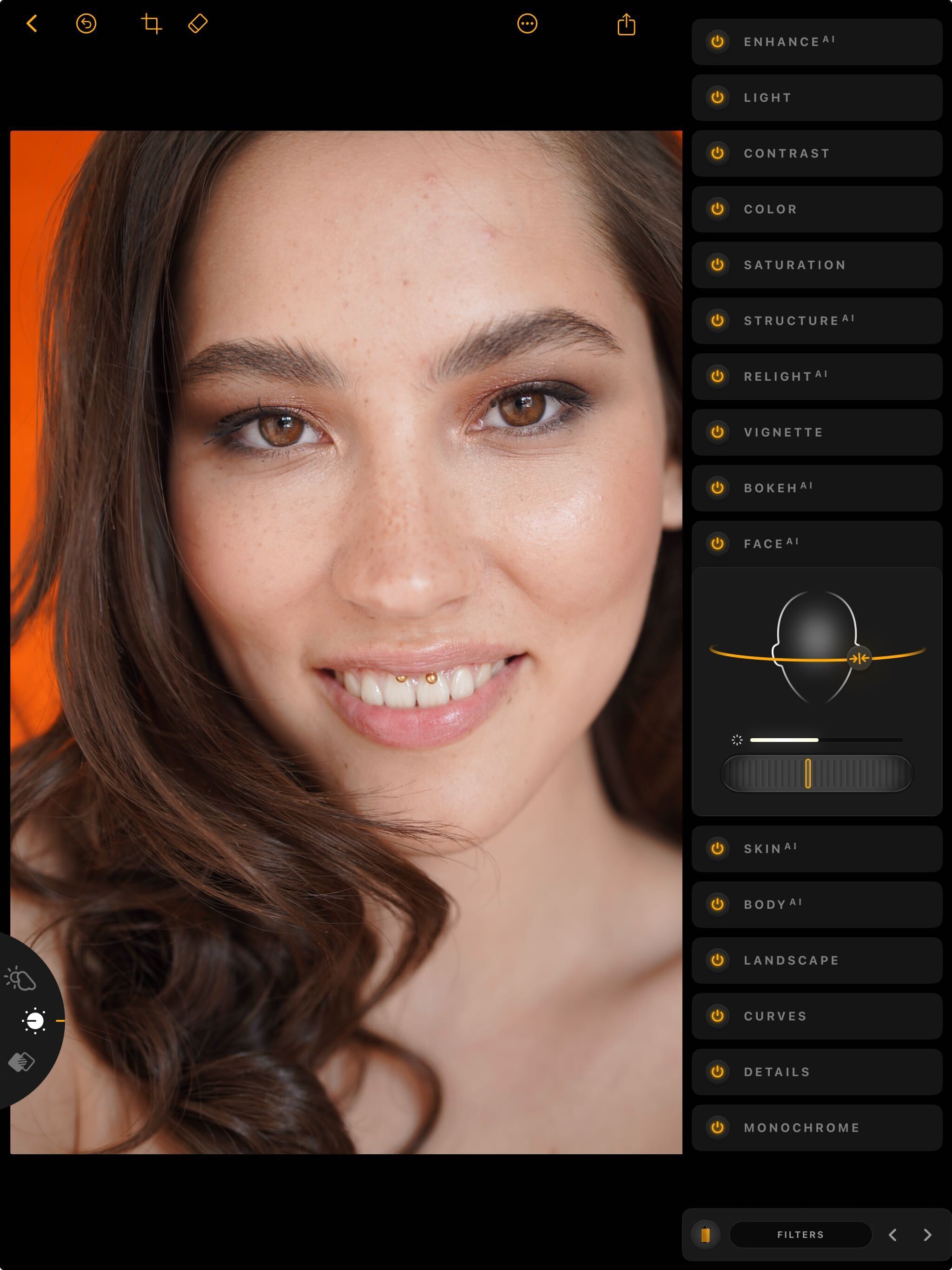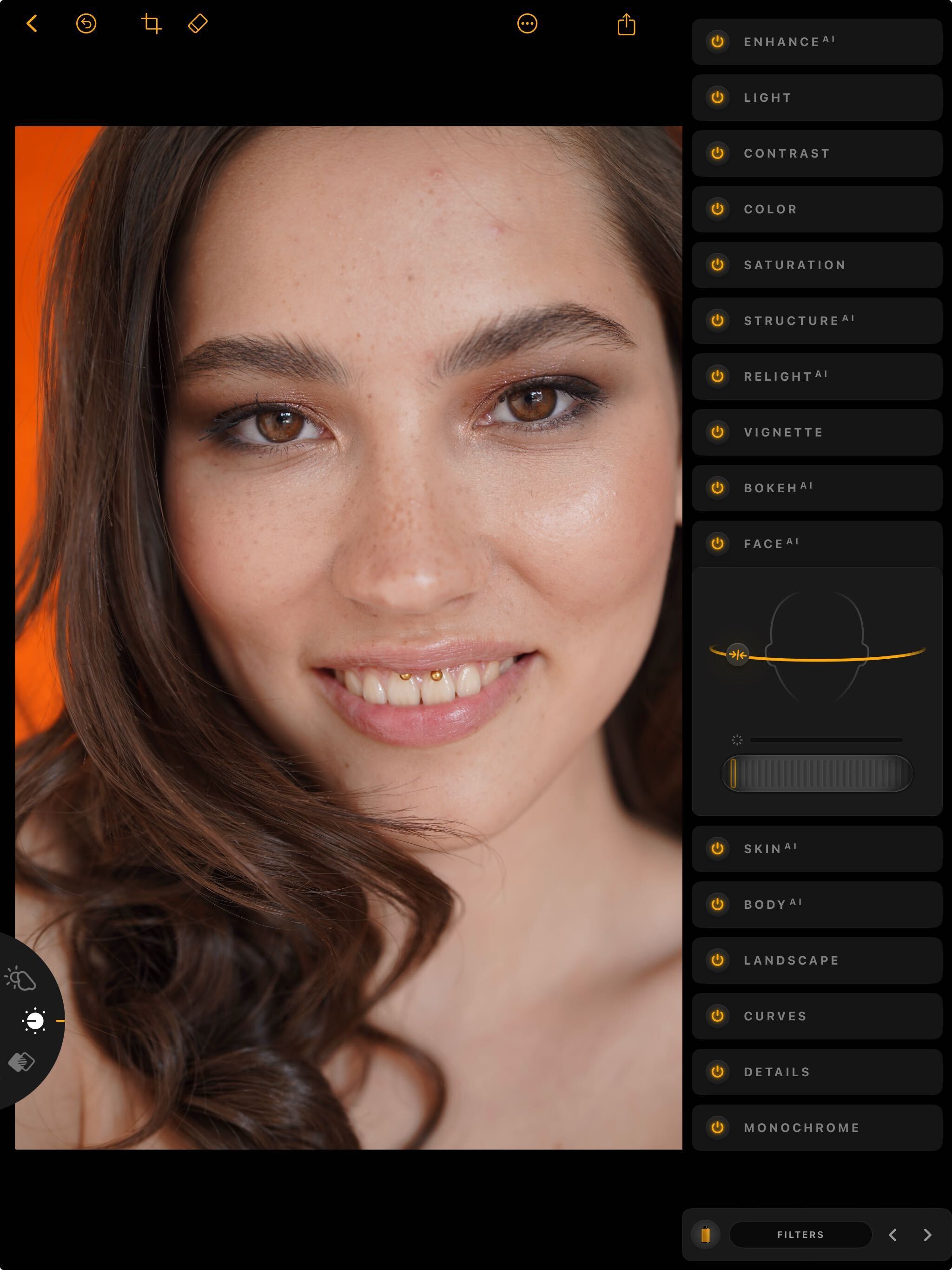 Skin AI automatically activates when a human face is detected in your image. It’s a portrait-specific tool designed to smooth skin while preserving natural texture and character.
