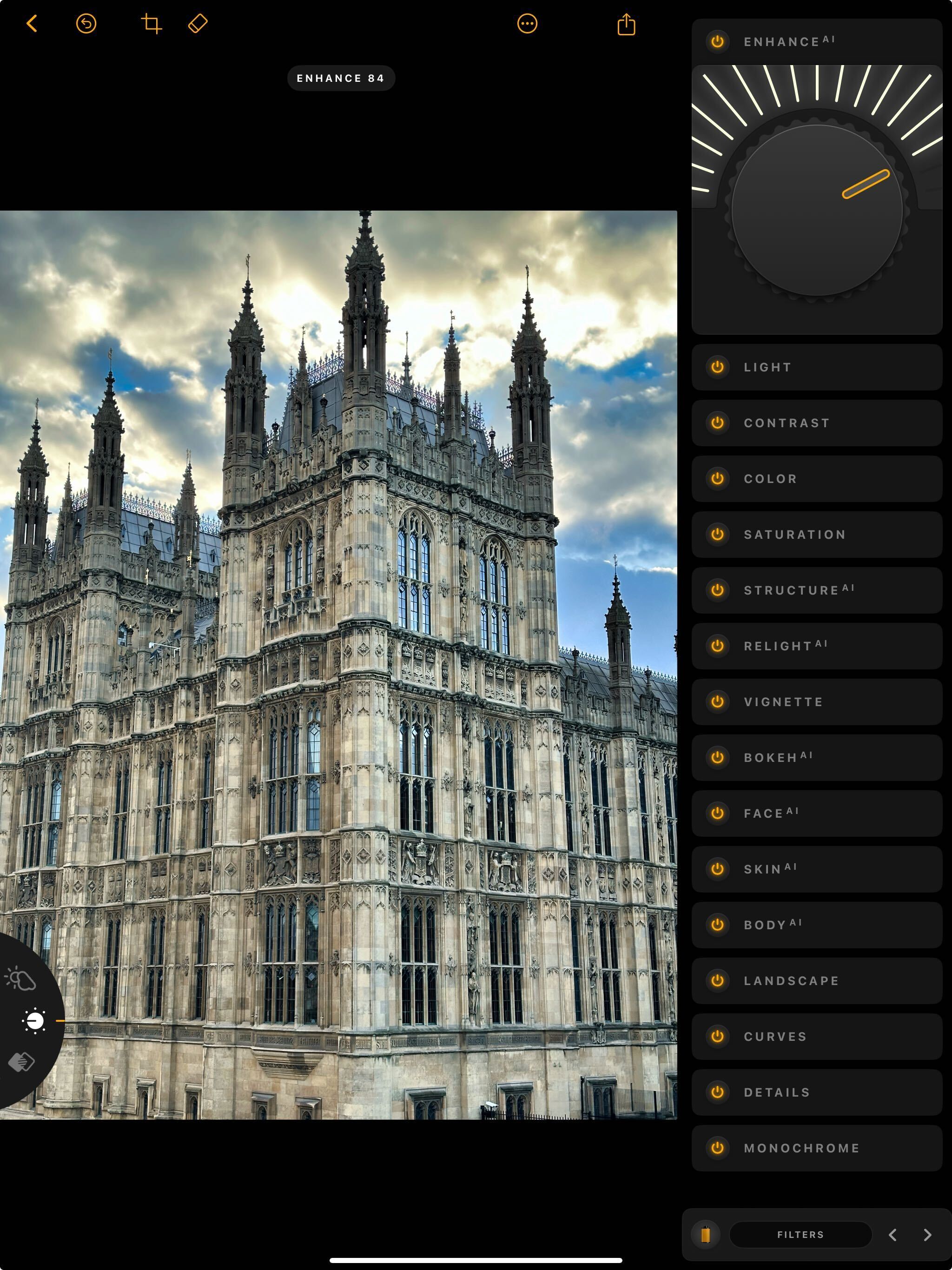 Enhance AI is your go-to tool for fast, intelligent improvement. It uses Luminar’s AI engine to analyze your photo and apply a balanced set of enhancements across exposure, contrast, color, detail, and tone.