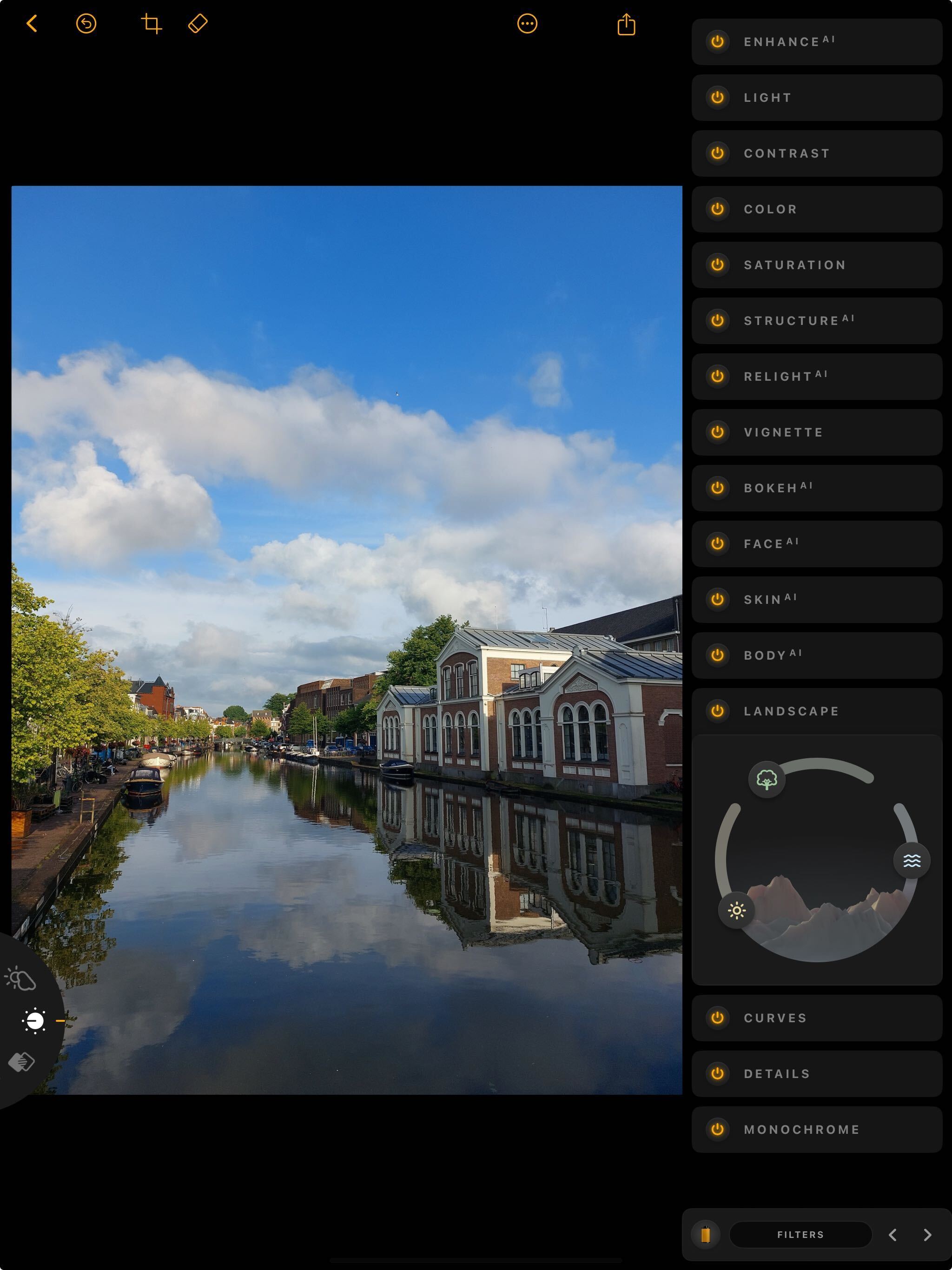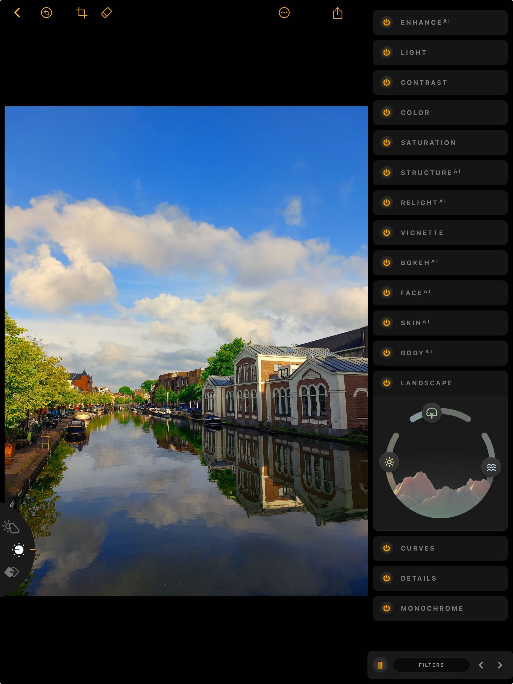 **How to Use:** Tap the Landscape icon, then tap any control and use the slider to move up or down. Each adjustment is applied individually for targeted enhancements.