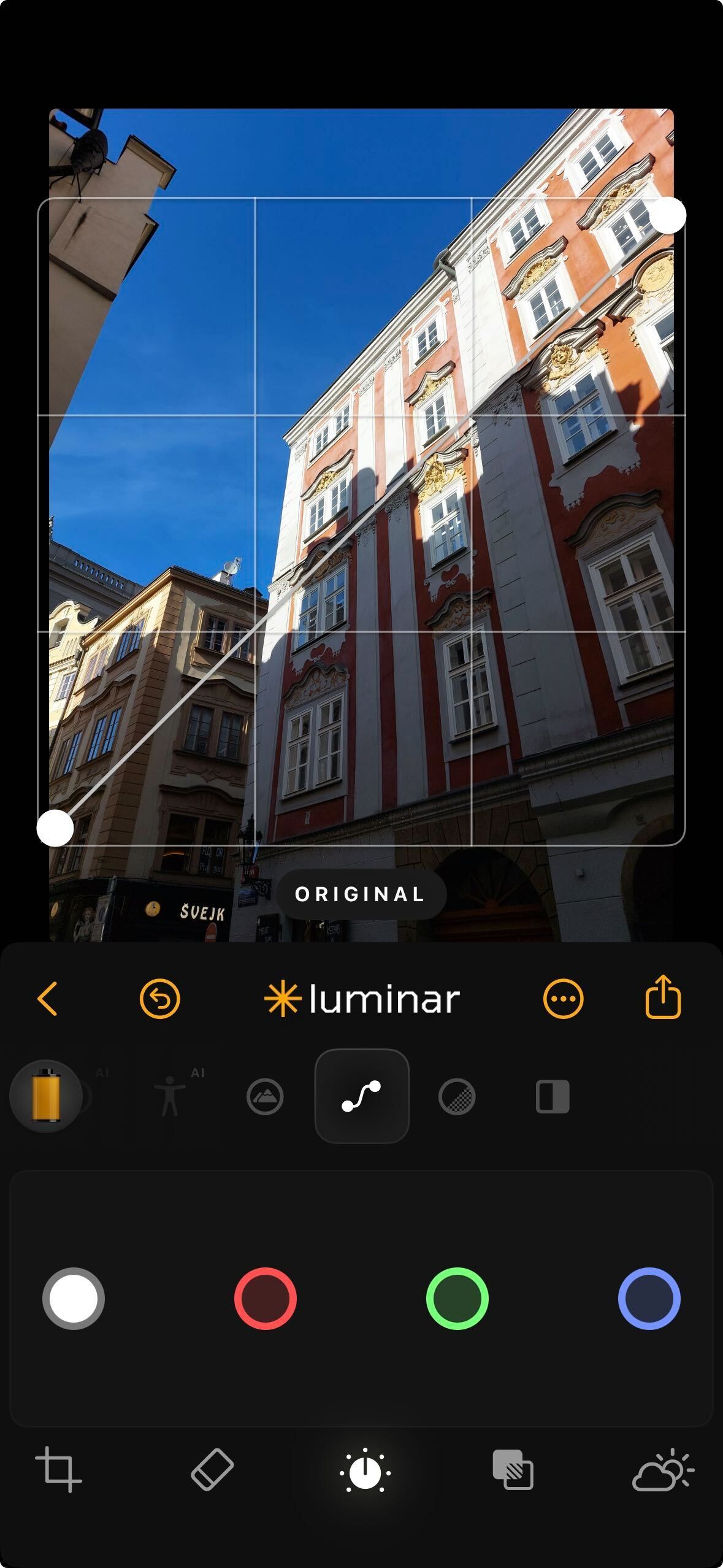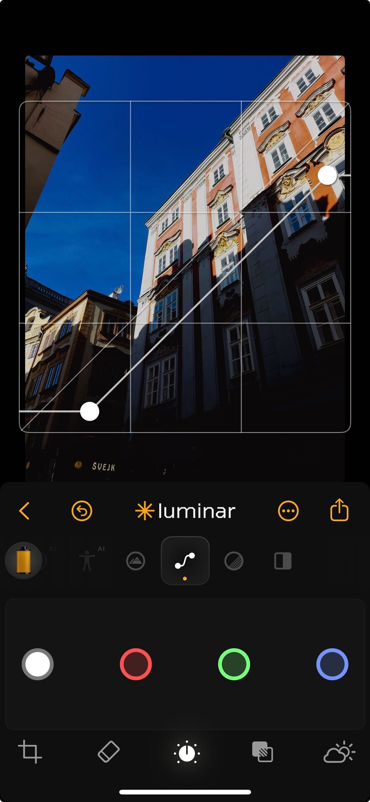 * **Color Selectors:** The Curves tool allows you to adjust brightness using white, red, green, and blue selectors, enabling channel-specific enhancements. To enhance the sky in your photo, utilize the blue selector to adjust the curve for desired effects. These selectors facilitate adjustments for the entire image or individual color channels, providing precise fine-tuning capabilities.