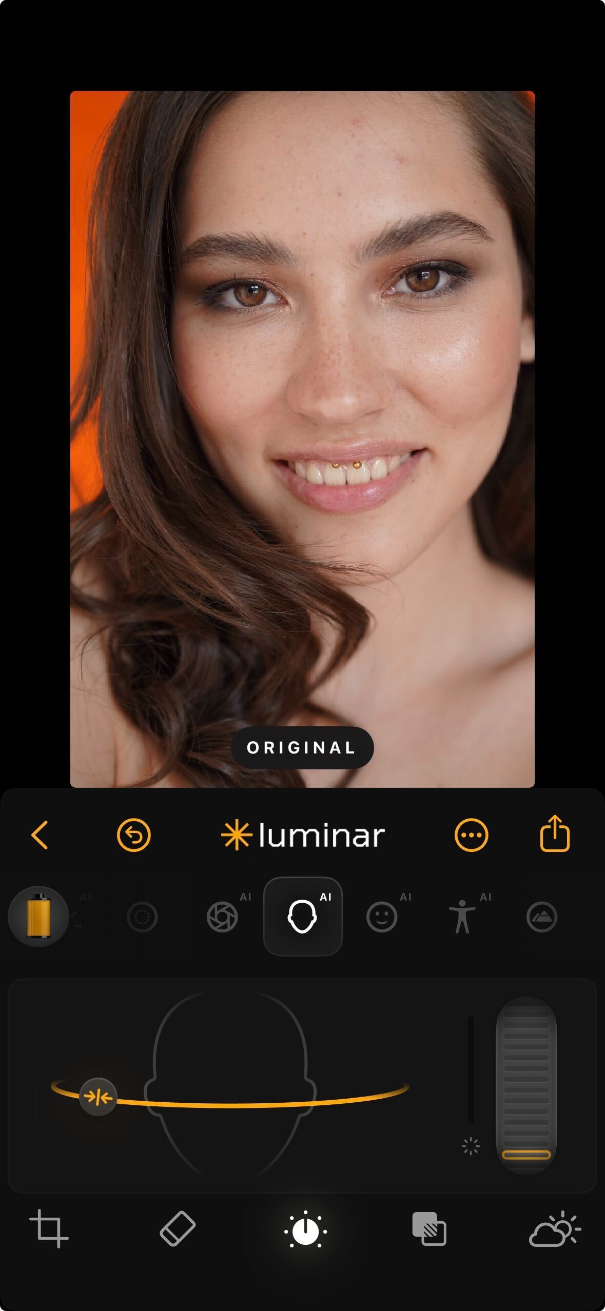 * **A Slider**: Controls the amount of skin smoothing. Reduces small imperfections without making the skin look overly processed or plasticky.