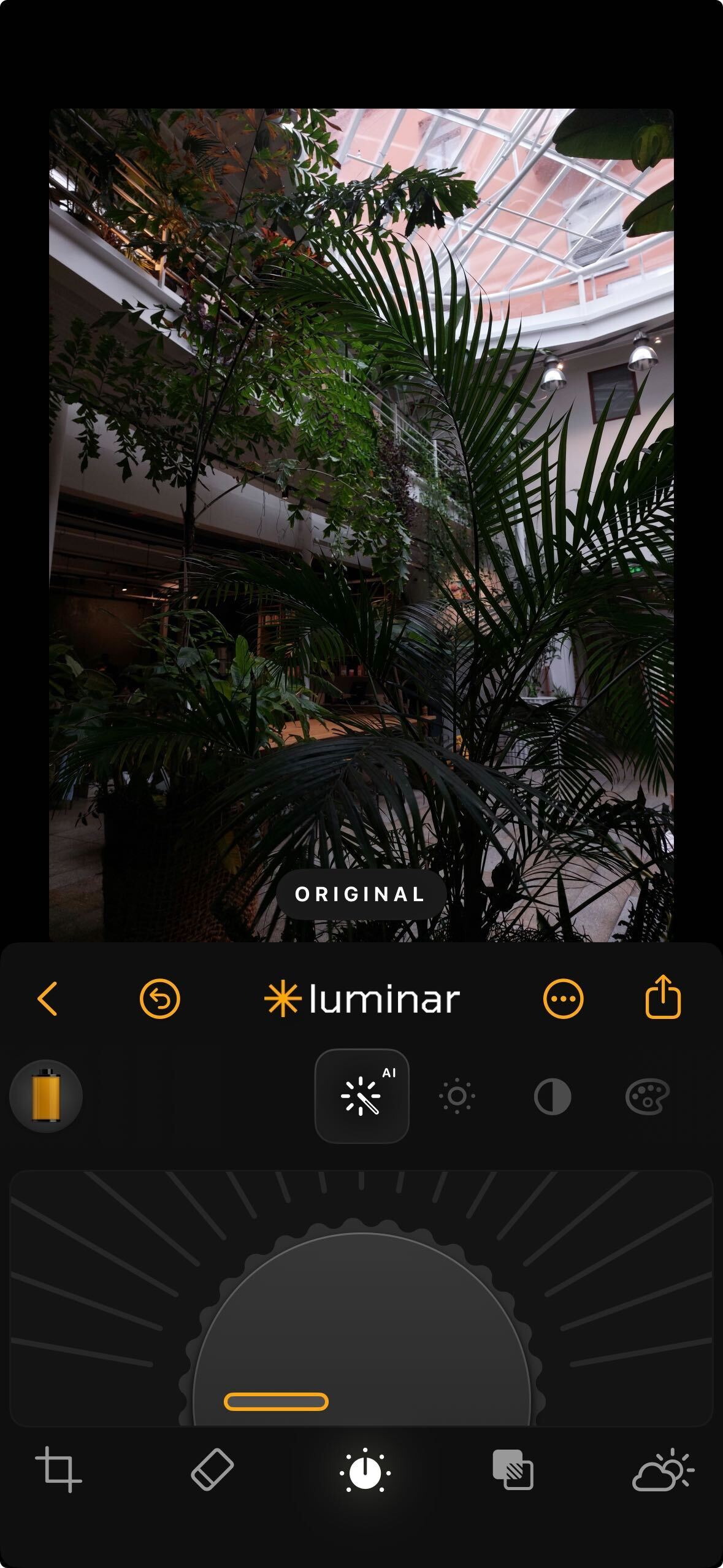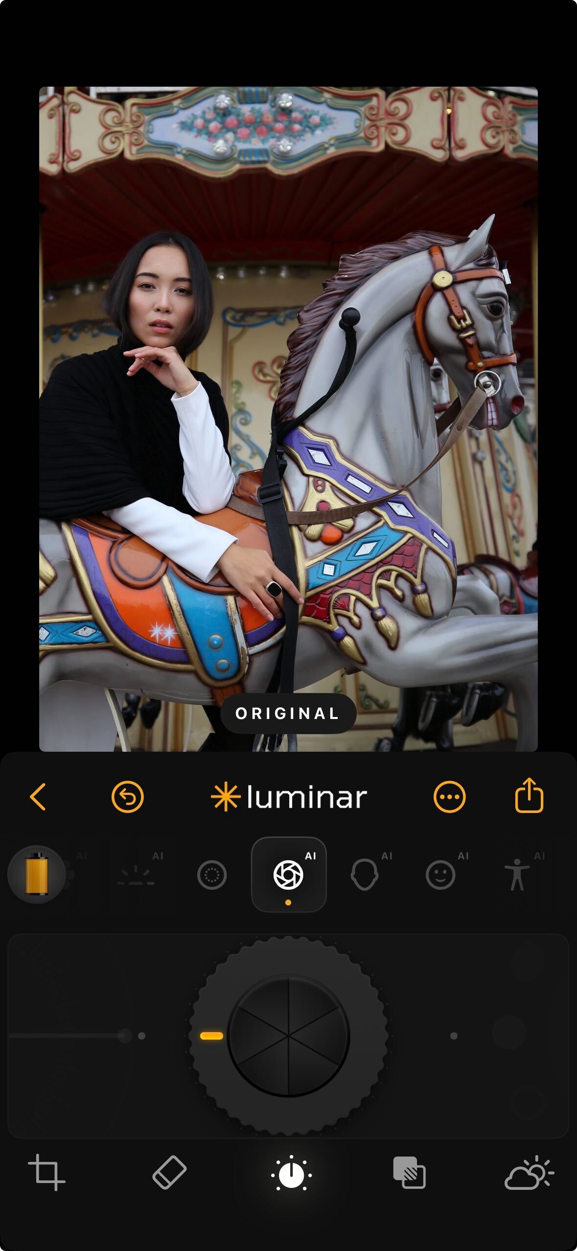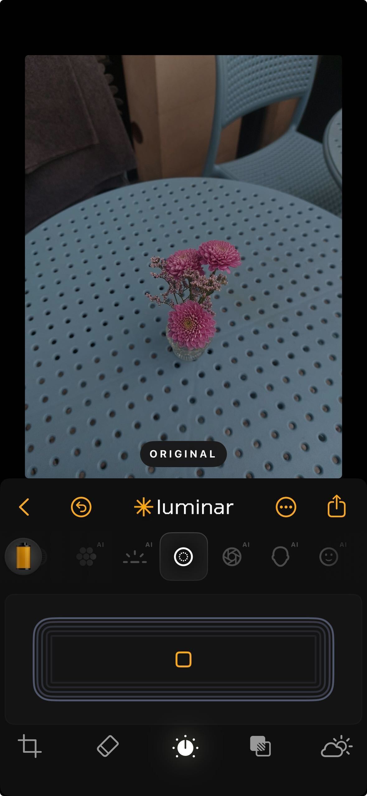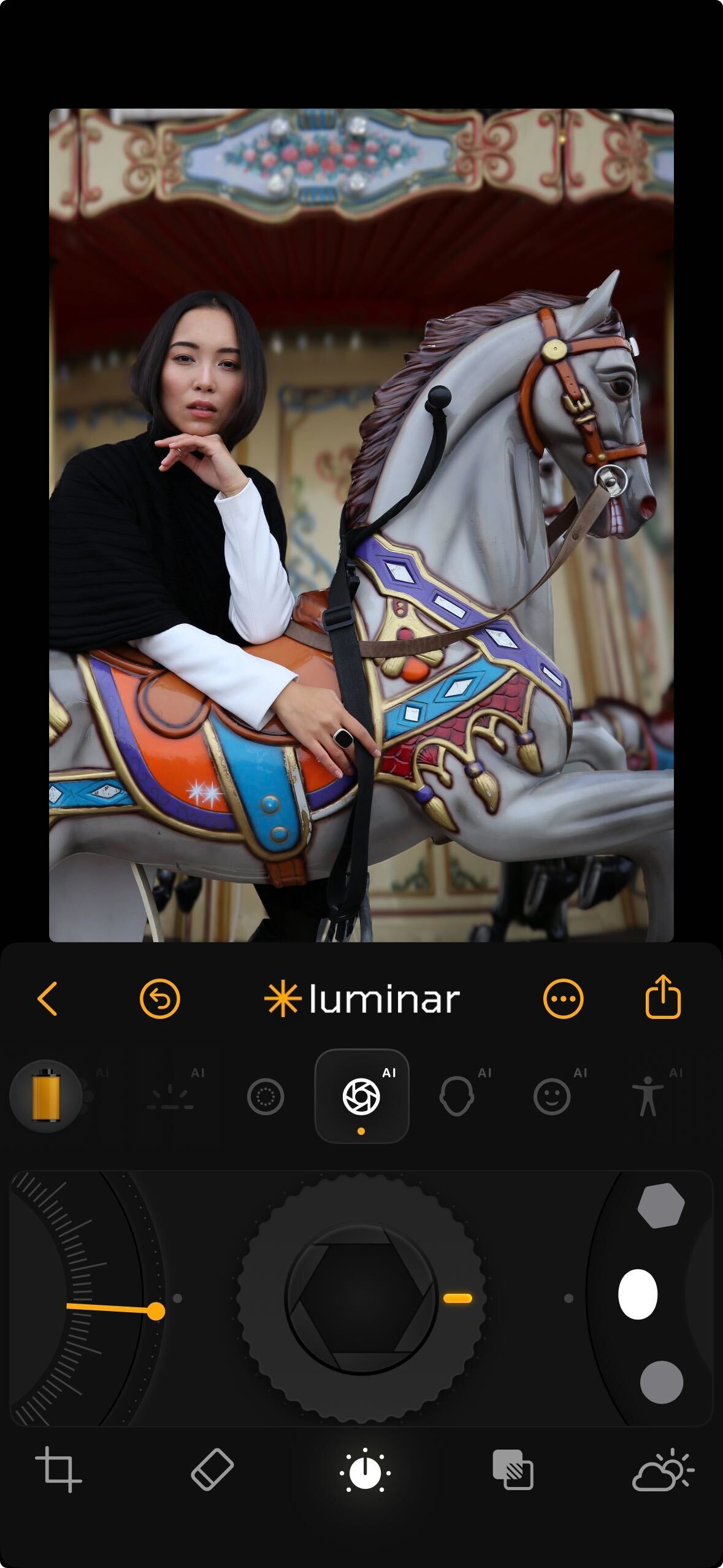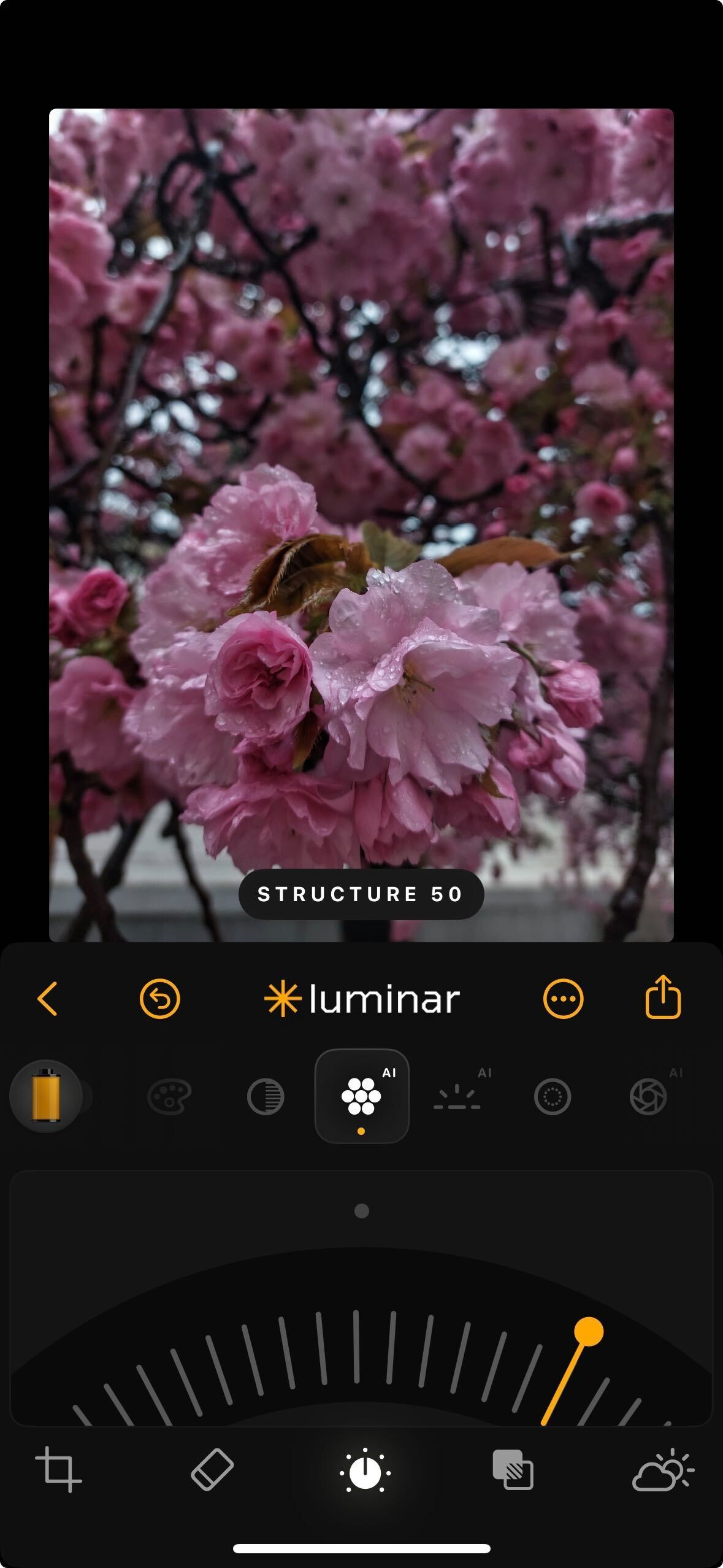 **How to Use:** Tap the Structure AI icon. Use the dial to apply more or less structure. As you increase the value, edges and surfaces become crisper while faces remain smooth and natural.