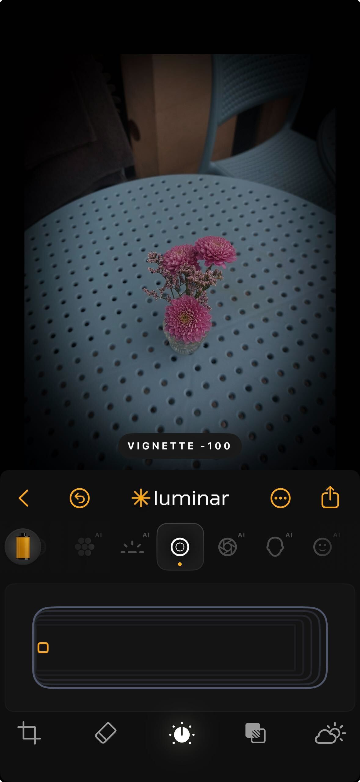 **How to Use:** Tap the Vignette icon and move the slider to adjust strength. The effect centers automatically on your subject but can be repositioned in future versions.