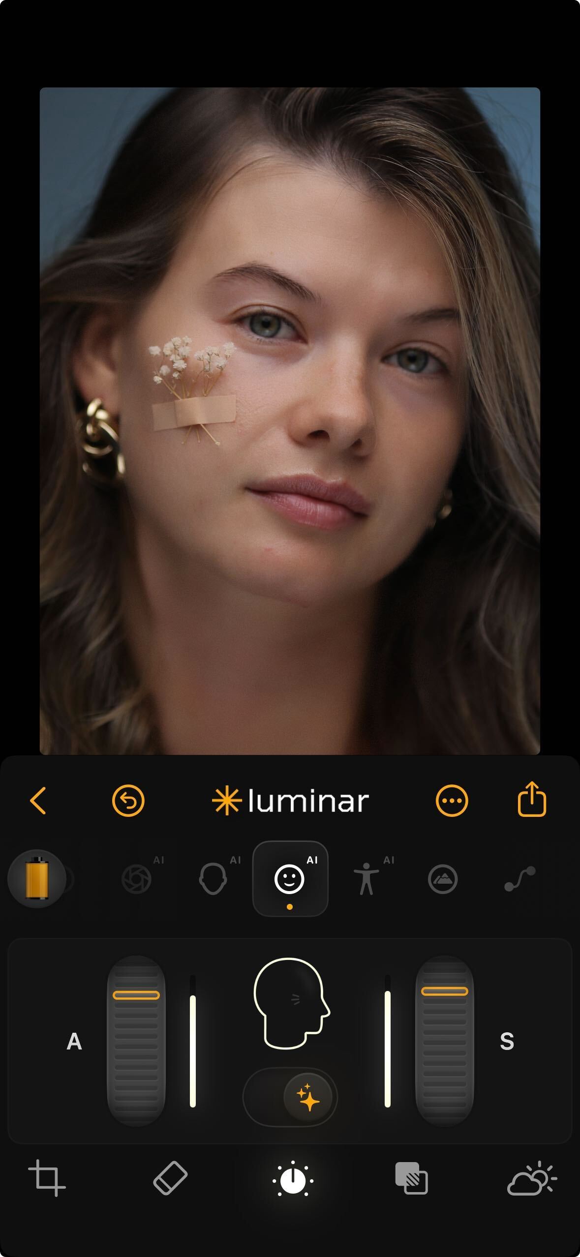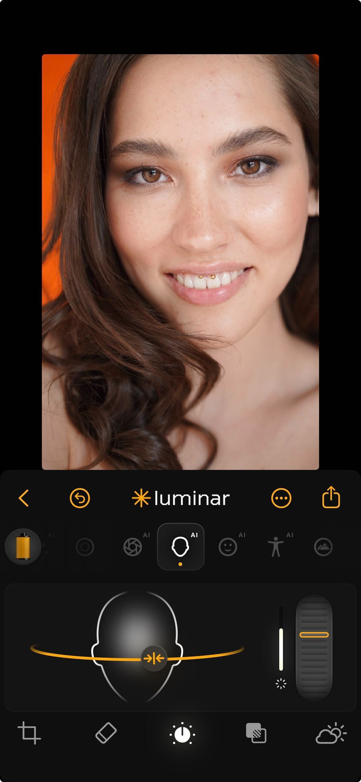 Skin AI automatically activates when a human face is detected in your image. It’s a portrait-specific tool designed to smooth skin while preserving natural texture and character.