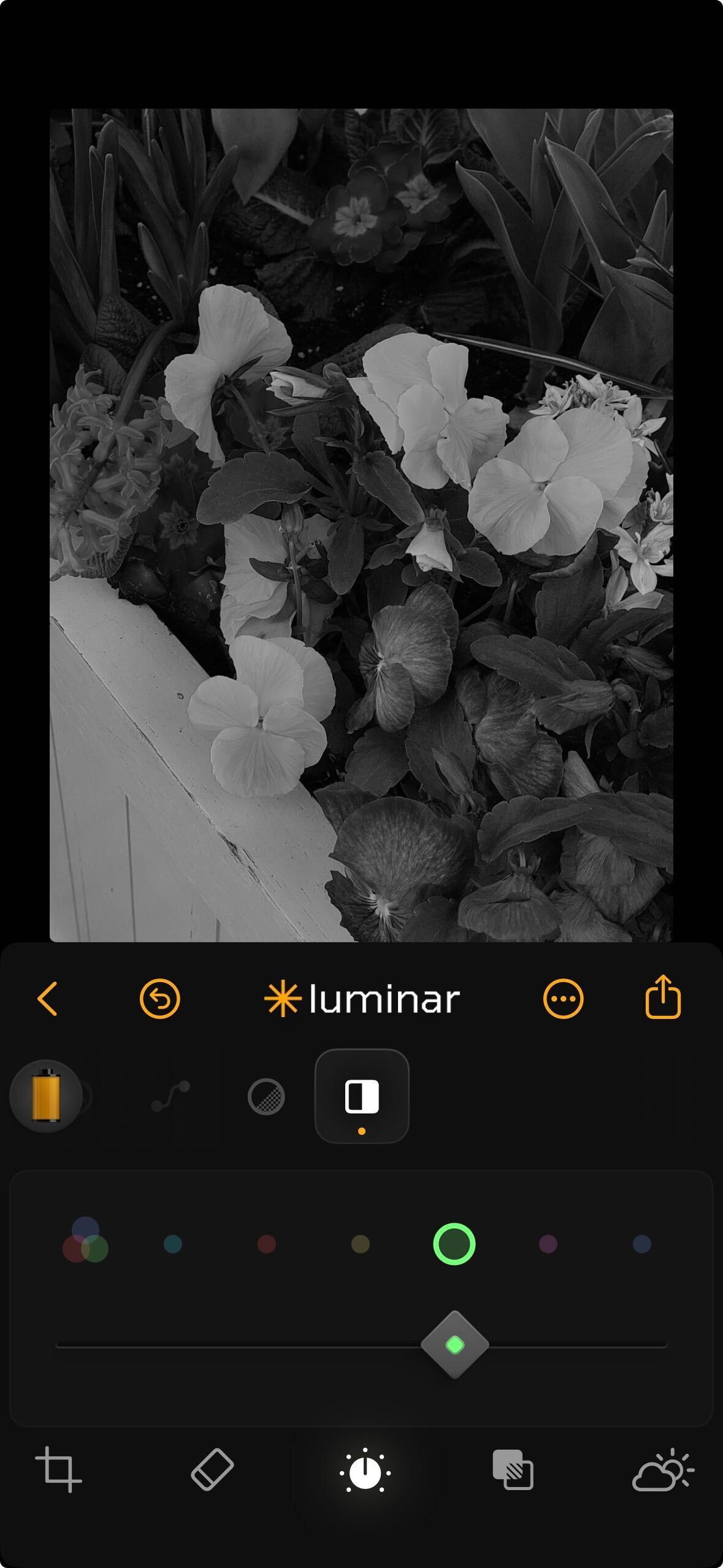 **How to Use:** Tap the Monochrome icon and slide to test different B\&W styles.